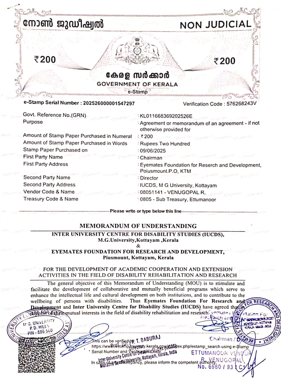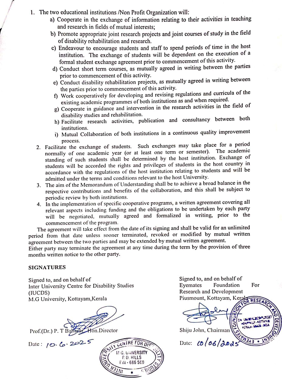 We are proud to collaborate with the Inter University Centre for Disability Studies (IUCDS) at Mahatma Gandhi University (MGU), Kottayam. This partnership bridges academic research and grassroots implementation, enabling us to: