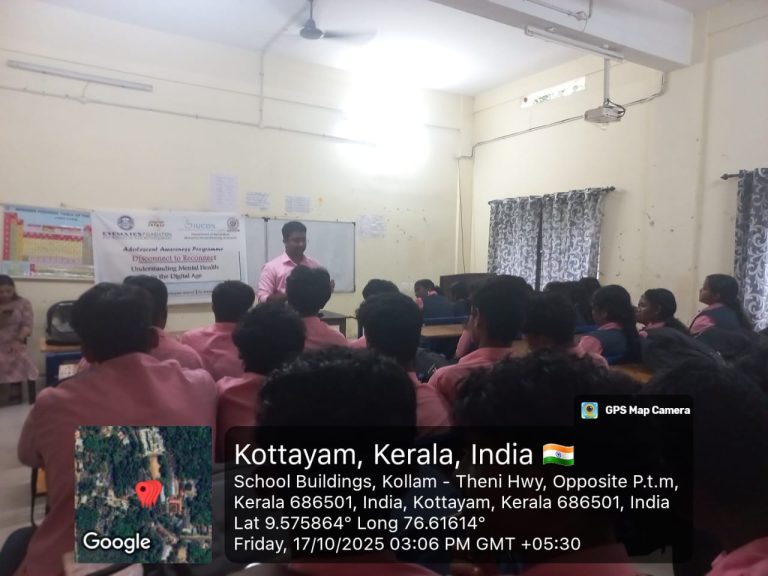 The Mental Health Awareness Programme titled “Disconnect to Reconnect” was conducted at Government Higher Secondary School, Areepparampu, Manarcadu on 21st October 2025 as part of the Connecting Future – Uniting Generations for a Sustainable Future campaign by Eyemates Foundation in collaboration with IUCDS–MGU. The session aimed to help students recognise the value of mental well-being and to promote mindful, balanced use of digital devices.