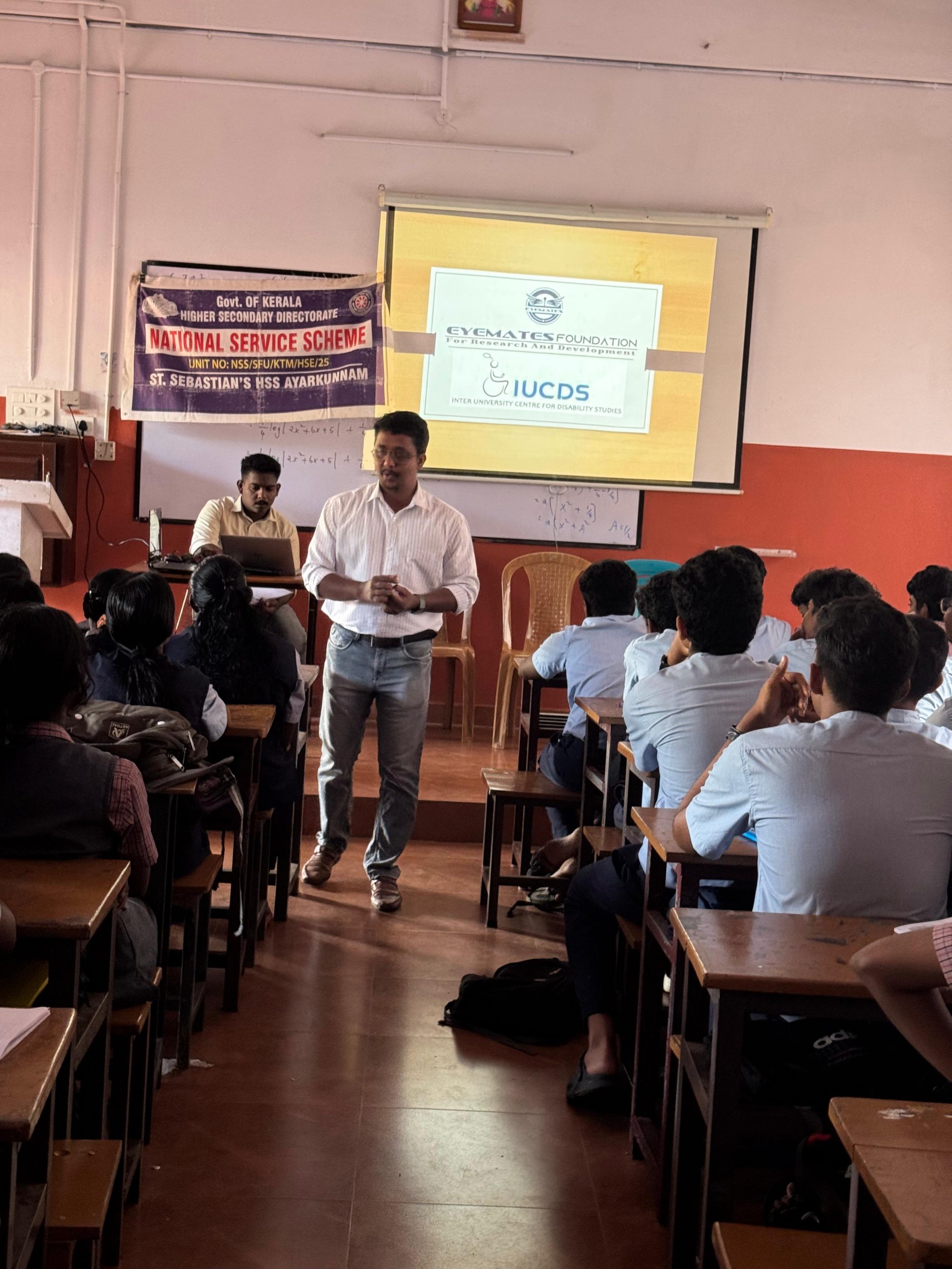 The session was facilitated by the professional team and volunteers from Eyemates Foundation and IUCDS–MGU. Photographs from the programme show active participation and meaningful engagement from both students and facilitators.