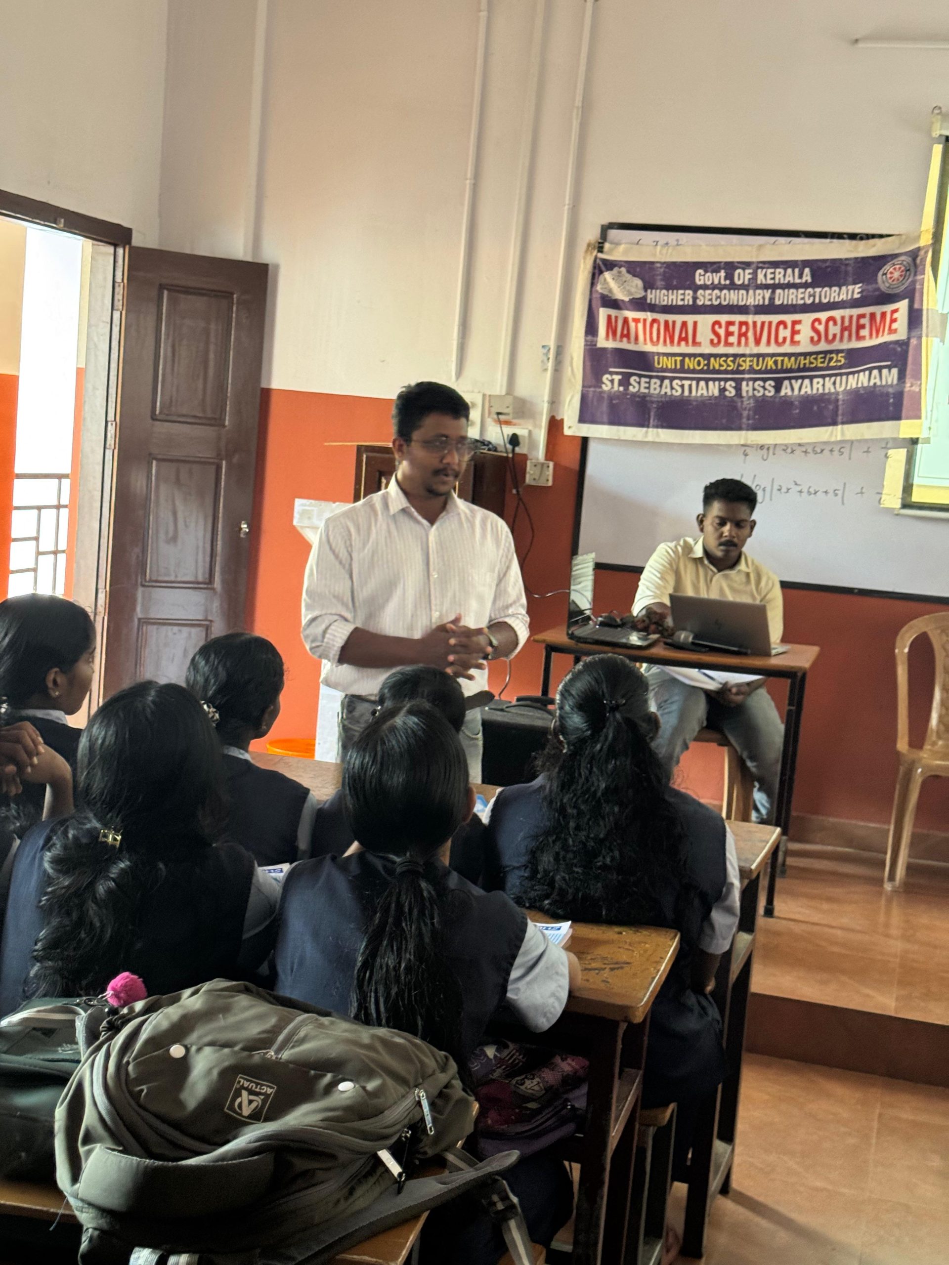 The Mental Health Awareness Programme titled “Disconnect to Reconnect” was conducted at St Sebastian’s Higher Secondary School, Ayarkunnam on 18th October 2025 at 10.00 am, as part of the Connecting Future – Uniting Generations for a Sustainable Future campaign initiated by Eyemates Foundation. The programme was organized in collaboration with IUCDS, Mahatma Gandhi University, and the NSS Unit of the school.