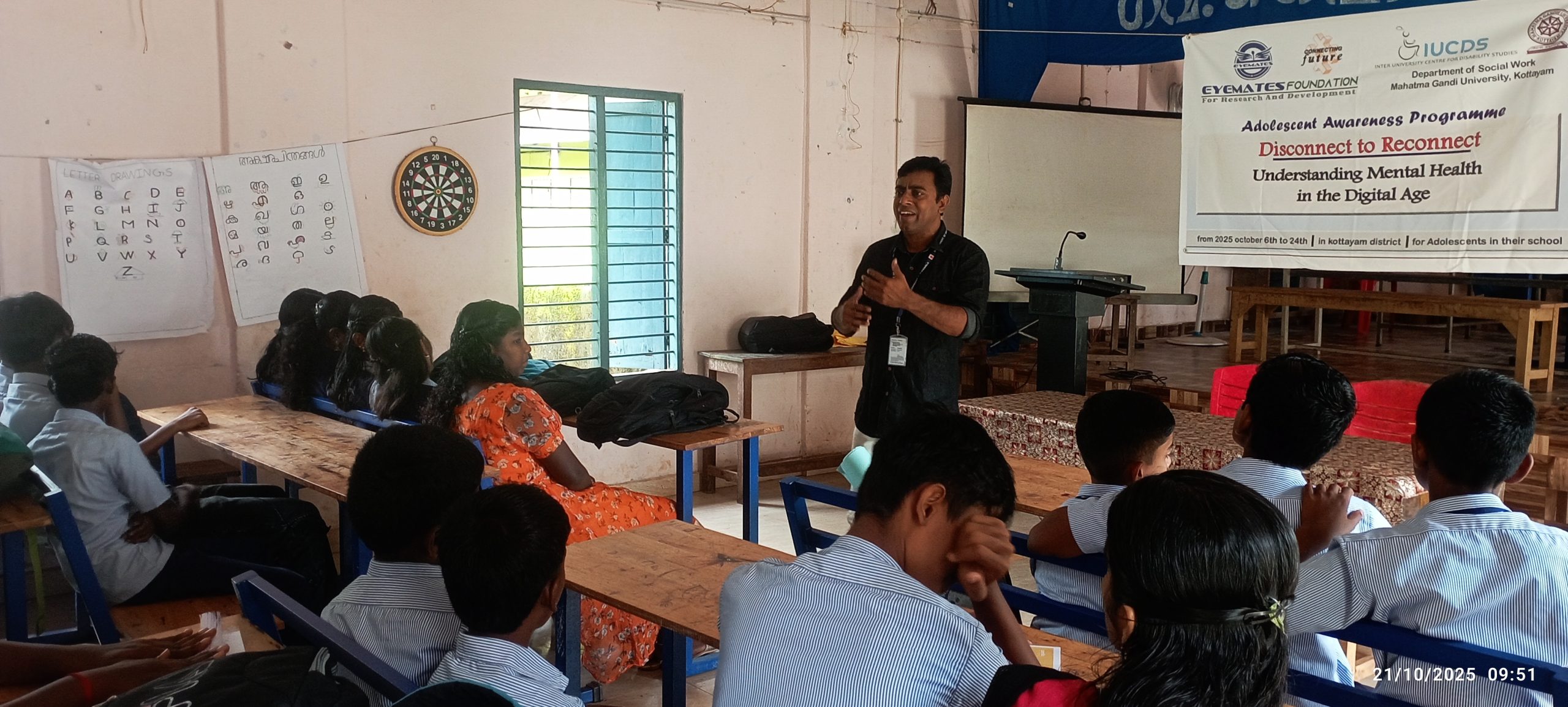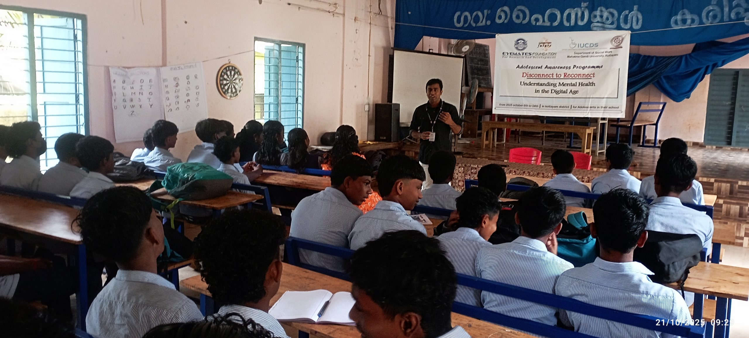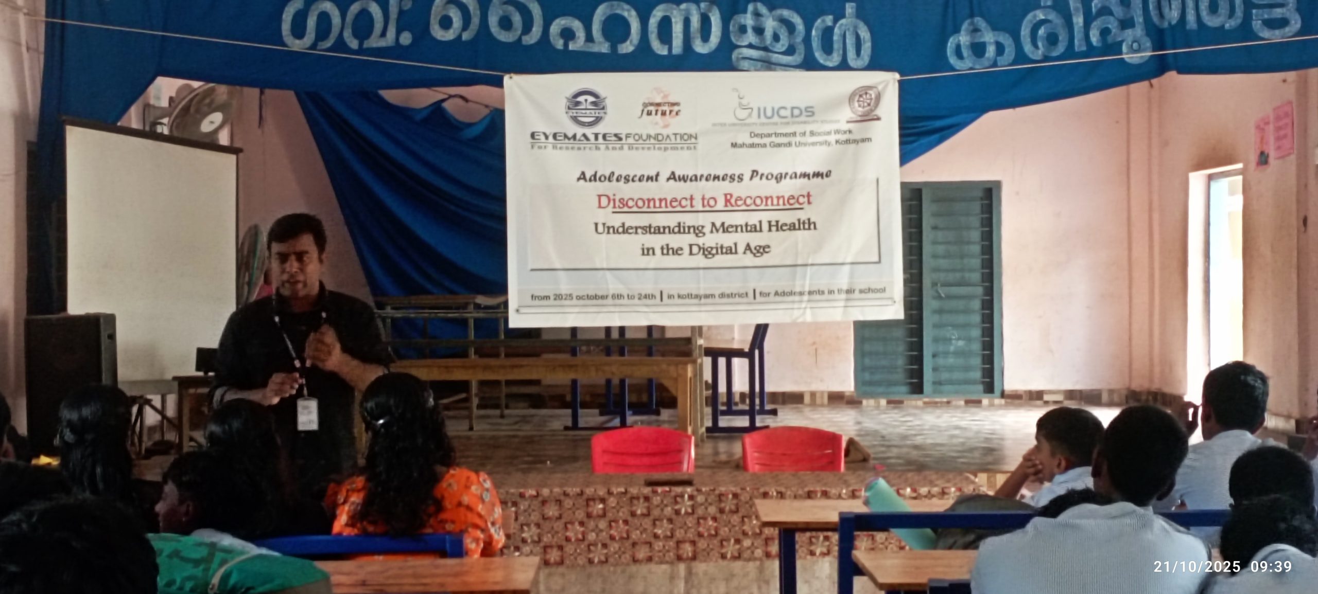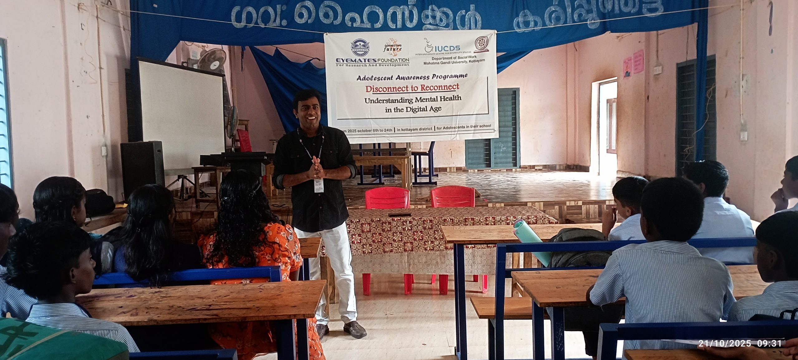 A mental health awareness session titled “Disconnect to Reconnect” was held at Government High School, Karipputhitta, Arpookkara on 21st October 2025 at 9.00 am. The programme was part of the ongoing Connecting Future – Uniting Generations for a Sustainable Future campaign launched by Eyemates Foundation, in association with IUCDS, Mahatma Gandhi University.