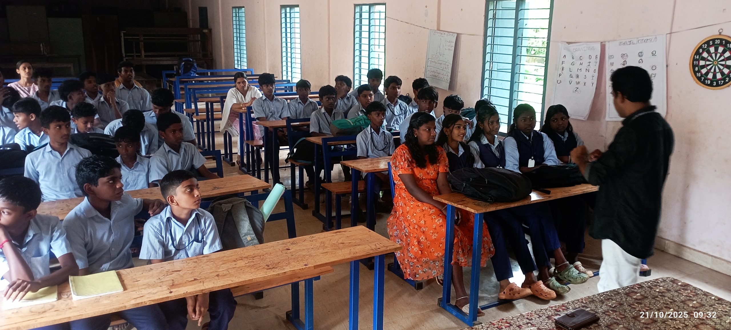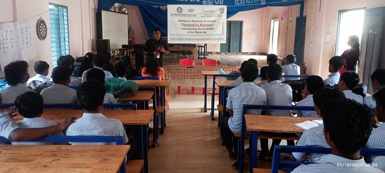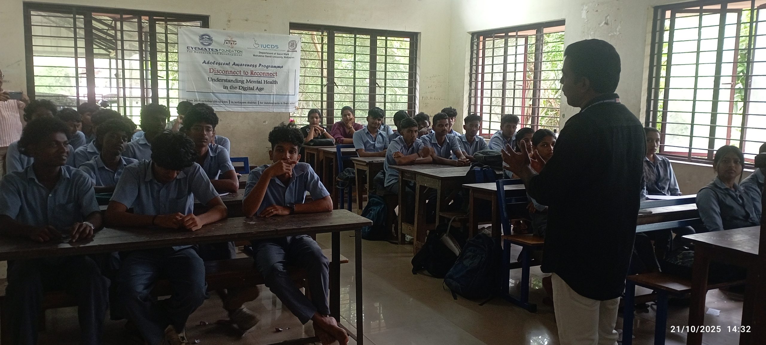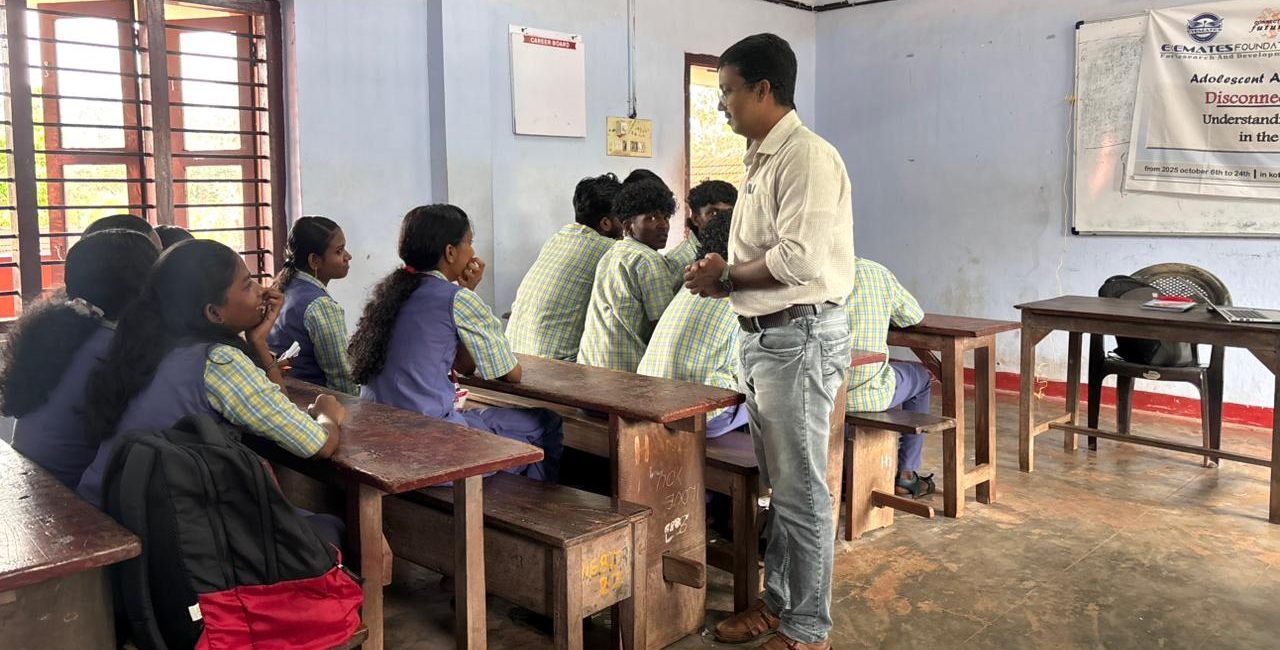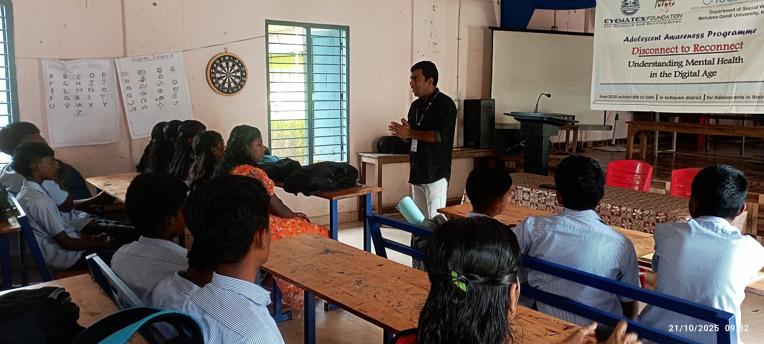 A mental health awareness session titled “Disconnect to Reconnect” was held at Government High School, Karipputhitta, Arpookkara on 21st October 2025 at 9.00 am. The programme was part of the ongoing Connecting Future – Uniting Generations for a Sustainable Future campaign launched by Eyemates Foundation, in association with IUCDS, Mahatma Gandhi University.